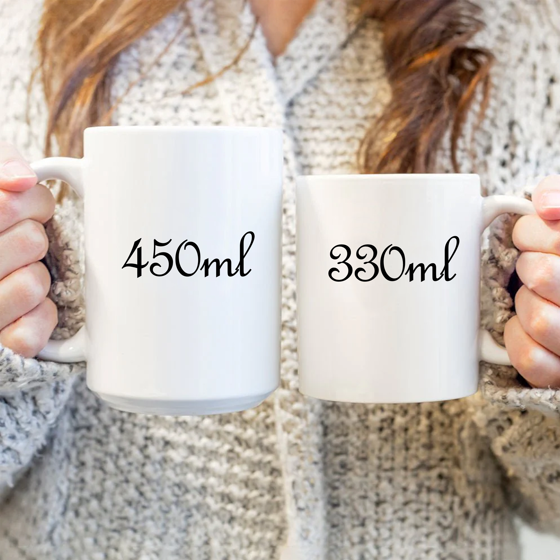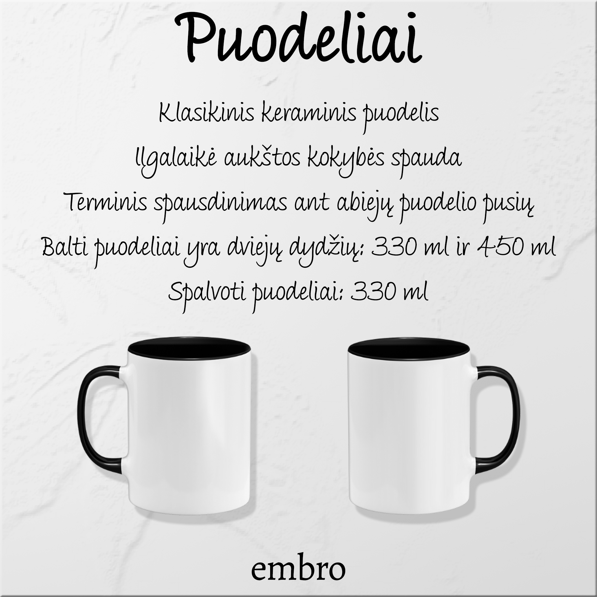 - Balti puodeliai yra dviejų dydžių: 330 ml ir 450 ml